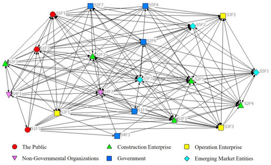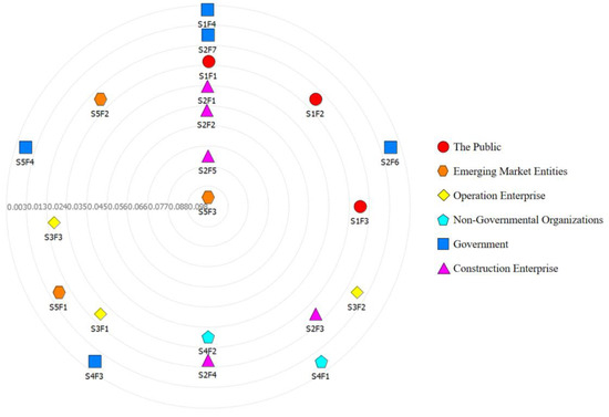 The findings are illustrated in Figure 4b. Several factors, including S1F1, S1F2, S2F4, S4F2, S2F5, S5F3, S2F1, S2F2, S3F1, and S2F3, exhibit high inward proximity centrality. This suggests that these factors are more adept at receiving influences from other elements, thereby warranting prioritization in policy formulation. The aforementioned factors encompass a diverse array of stakeholders, including non-governmental organizations, operational entities, construction firms, and public institutions. These stakeholders demonstrate a significant capacity to absorb influences, and are particularly susceptible to changes in market dynamics, technological advancements, and social conditions. Notably, the two most influential factors identified are S1F1 and S1F2, which indicates that public entities are particularly vulnerable to the impacts of other factors. Furthermore, it is observed that most government-related factors are positioned at the periphery of the diagram, implying that these factors experience longer pathways of influence from other elements within the network.