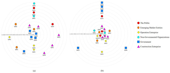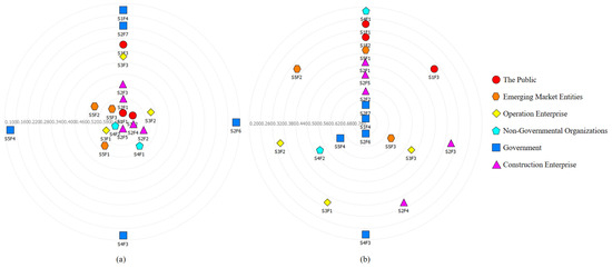 In-degree centrality serves as a measure of the degree to which a node is affected by other nodes within a network. A node’s proximity to the center correlates positively with its in-degree centrality value. The findings are illustrated in Figure 3a, which identifies S1F1, S1F2, S2F4, S2F5, S4F2, S5F3, S2F1, S2F2, S3F1, and S2F3 as the driving factors exhibiting elevated in-degree centrality. Notably, S1F1 and S1F2 possess the highest centrality values, suggesting that public perceptions are significantly influenced by various other factors. Additionally, S2F4, S2F5, S4F2, and S5F3 demonstrate substantial centrality, indicating their critical roles within the network. From a stakeholder perspective, the most influential participants are the public and construction entities, highlighting their heightened vulnerability to fluctuations and changes from other network entities. Conversely, the in-degree centrality values associated with government-related driving factors are comparatively low, suggesting that governmental entities are less susceptible to external influences.