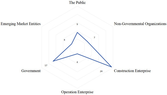 A stakeholder radar chart was developed, as illustrated in Figure 6, reflecting the frequency of various factors. The analysis indicates that construction entities, government entities, and public entities exhibit the highest frequency, thereby identifying them as the most significant contributors to the low-carbon development within the construction industry.