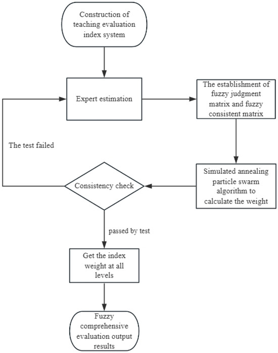 The improved simulated annealing particle swarm algorithm is used to solve the objective function, which is the fuzzy consistency matrix established in the evaluation of the ASD course, so as to obtain the weight coefficients of the indicator layer and the program layer, and the process of its solution is realized in Matlab 2023b. The fuzzy consistency matrix is calculated using the improved algorithm in order to solve for the weight coefficients with optimal consistency. The process of evaluating the ASD course is shown in Figure 2.
