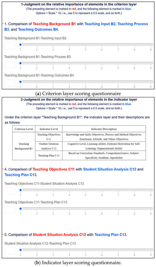 The scoring scale is set from 0.1 to 0.9, and each evaluation element and its corresponding scale is shown in Table 1. The specific scoring method refers to Table 2, comparing two evaluation elements. The 0.5 scale is equally important, 0.6 scale is slightly important, 0.7 scale is obviously important, 0.8 scale is strongly important, 0.9 scale is extremely important, and the higher the scale, the higher the importance of the former element represented. 0.1–0.4 scale is for the inverse comparison, i.e., the importance of the latter element over the former element is 1–(0.1~0.4) scale. In order to facilitate statistical calculations, the original scale is enlarged by 10 times when setting the options in the questionnaire, i.e., 5 is used to represent 0.5 scale, and so on. For example, suppose “teaching background” B1 is compared with “teaching results” B4, and the respondents think that “teaching background” is slightly more important than “teaching results”. For example, if “teaching background” B1 is slightly more important than “teaching achievements” B4, the scale is 0.6, corresponding to option 6; if “teaching achievements” is slightly more important than “teaching background”, the scale is 0.4, corresponding to option 4. The design of the questionnaire page is shown in Figure 3.