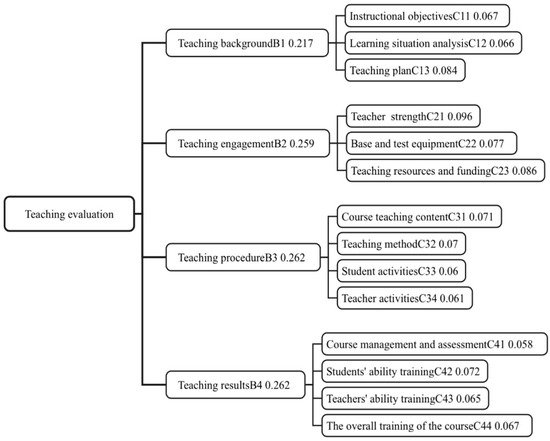 The fuzzy analytic hierarchical process (FAHP) is a system analysis method combining qualitative and quantitative methods proposed by Prof. T. L. Saaty of American Operations Research in the 1970’s. FAHP improves the problems that face the traditional AHP and improves the reliability of decision making. The teaching evaluation steps based on FAHP are the construction of a hierarchical model, establishment of a fuzzy judgment matrix, establishment of a fuzzy consistency matrix, hierarchical single ranking, hierarchical total ranking, and fuzzy comprehensive evaluation. Chen et al. [42] proposed a novel framework for teaching performance evaluation that combines the fuzzy analytic hierarchy process (FAHP) with the fuzzy comprehensive evaluation method. In this framework, the teaching evaluation hierarchy includes six factors: planning and preparation; communication and interaction; teaching for learning; managing the learning environment; student evaluation; and professionalism. Each of these is further divided into two or more sub-factors. In the AHP hierarchy model proposed by Thanassoulis et al. [43], the criteria for teaching evaluation consist of two aspects: course and teacher. The course is further analyzed through two sub-criteria: overall interest and the perceived practicality of the course from the students’ perspective. The teacher dimension is analyzed into four sub-criteria: preparation, professionalism, presence, and supporting material. Taking the ASD course as the evaluation object, combined with the direction of evaluation of college courses that have appeared in the previous literature, this paper comprehensively unfolds the teaching evaluation index system in order to carry out a division of evaluation indexes in all aspects, and it constructs a multi-level index system of the target layer, criterion layer, and index layer. Based on the CIPP model, the course evaluation index system is divided into four first-level indicators and 14 second-level indicators, as shown in Table 1. The first-level indicators include four items, including teaching background, teaching input, teaching process, teaching results, teaching effect, etc. This indicator involves the main aspects of course construction, and is the main factor affecting the construction of the course and the core objective of course evaluation. There are 14 items in the secondary indicators, which are the further refinement of the corresponding primary indicators and the items to be evaluated in each main aspect. They are the sub-targets of the course evaluation and are a series of basic target layers around the realization of the sub-targets, and they are also the evaluation elements for the specific realization of the sub-targets.