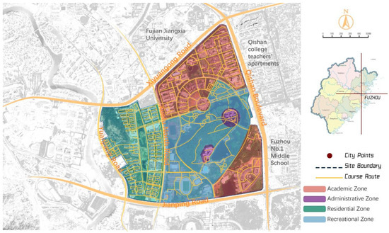 Fuzhou University is located in Fuzhou, the capital city of Fujian Province, on the southeastern coast of China. The case study focuses on the Qishan Campus of Fuzhou University, located at 26.0789° N, 119.2062° E (Figure 1). The Qishan Campus covers an area of 3249.72 acres (with 2389.37 acres allocated to the academic area and 860.35 acres to the residential area), with a planned construction area of 1.3933 million square meters (including 669,800 square meters for academic buildings, 502,500 square meters for residential buildings, and 221,000 square meters for the technology park).
