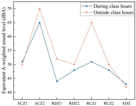 We compared the equivalent A-weighted sound levels in different soundscape areas during class hours and after class hours, and the results are shown in Figure 3. The equivalent A-weighted sound level (LAeq) during non-class hours was generally higher than that during class hours. During class hours, students were mostly focused inside classrooms, with fewer outdoor activities, and the environmental noise was dominated by background sounds, resulting in lower overall sound levels. In contrast, during non-class hours, students engaged more in outdoor social activities, sports, and other events, adding more sound sources such as human voices, equipment operation, and vehicle traffic, leading to a significant increase in sound levels. Additionally, the noise level in Teaching Area 1, which was primarily influenced by construction sounds, was noticeably higher during non-class hours compared to class hours, due to ongoing construction work in the nearby area generating substantial noise. On the other hand, the administrative area showed minimal differences in sound levels between the two time periods, likely due to its relatively low exposure to external sound sources or stable background noise.