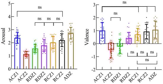 Differences in EEG indicators across different soundscape groups (left: arousal; right: valence) (ns: not significant (p > 0.05)).