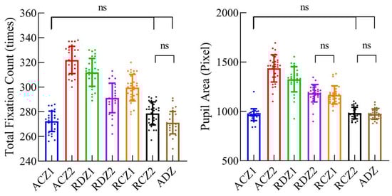 Differences in eye-tracking indicators across different soundscape groups (left: total fixation count; right: pupil area) (ns: not significant (p > 0.05)).