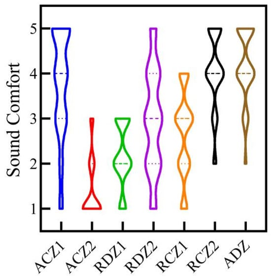 According to the acoustic comfort evaluation results (Figure 6), significant differences were observed in acoustic comfort levels across different areas. Overall, regions dominated by natural soundscapes (ACZ1, RCZ2, and ADZ) exhibited higher acoustic comfort scores, with ACZ1 and ADZ standing out as the highest. This indicates that natural sounds such as wind, bird songs, and insect chirping have a notable advantage in enhancing comfort, providing users with a more relaxing auditory experience. In contrast, areas dominated by artificial soundscapes (ACZ2 and RDZ1) showed lower acoustic comfort scores, with ACZ2 scoring the lowest. This is likely due to harsh noises such as construction sounds and crowd noise, which can lead to auditory discomfort and psychological fatigue.