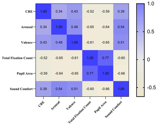 To explore the effects of different factors on perceived restoration, Pearson correlation coefficients were calculated among eye-tracking metrics, EEG indicators, acoustic comfort, and subjective perceived restoration across all seven scenarios. The results showed significant positive correlations between arousal, valence, acoustic comfort, and subjective perceived restoration (Figure 7). Conversely, fixation count and pupil size were significantly negatively correlated with subjective perceived restoration. This indicates that higher levels of perceived restoration are associated with fewer fixations and smaller pupil area, as well as greater arousal, valence, and acoustic comfort.