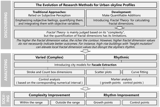 Thereafter, skyline evaluation research has witnessed a notable emphasis on quantifiable supplements. Diverging from qualitative evaluations complemented by quantitative measures, these supplements veer toward independent quantitative evaluations underpinned by a discernible developmental trajectory. For instance, scholars hierarchically partitioned and evaluated coastal skylines of urban samples, laying the groundwork for future in-depth quantitative evaluations [15] (2010). Subsequently, scholars encapsulated this progression in an Analytic Hierarchy Process (AHP) framework [16] (2013). In recent years, scholars introduced a quantitative skyline evaluation method based on visual influence, incorporating two indicators—tortuosity and layering—expressed through mathematical formulations. They also proposed a three-dimensional GIS-based urban skyline simulation technology, providing a cornerstone for subsequent GIS-based simulation analyses and evaluations. Moreover, scholars anchored tortuosity, introducing the Fractal Theory [17] (1982) pioneered by mathematician B.B. Mandelbrot [18] (2013), scholars conducted a quantitative evaluation of urban waterfront landscape skylines based on Fractal Theory [19] (2017).