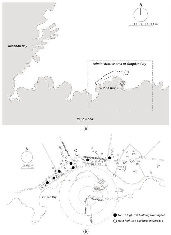 According to the description in the introduction of this paper, a city sample needs to have at least two characteristics: first, it must be an urban waterfront area, and second, it must have good observation points. This paper ultimately selects the Qingdao (Shandong Province, China) Fushan Bay waterfront building cluster as the evaluation sample, which meets both of these criteria. Furthermore, expanding on the second point, the ratio of the visual distance (D) between the observation point and the buildings to the building height (H) should fall within the range where a complete visual perception image can more easily form within the human field of vision, i.e., D ≥ 3H.