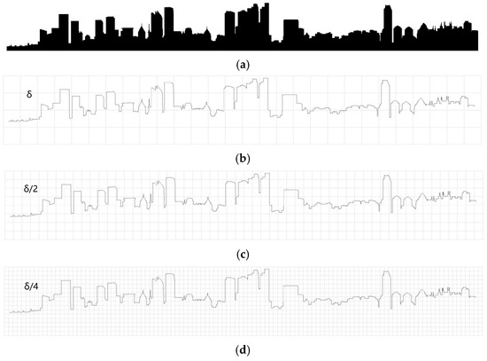 Demonstration of the specific operation of complexity evaluation. (a) The initial skyline. (b) The initial grid, the size is δ. (c) The second grid, the size is δ/2. (d) The third grid, the size is δ/4.