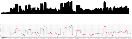 The specific methodology is as follows: Based on the size of the skyline, a grid of 110 units on the horizontal axis and 11 units on the vertical axis is drawn. The horizontal axis is divided into more points to ensure accurate curve-fitting, and the horizontal axis spacing should be sufficient to ensure that the tall buildings raised on the vertical axis intersect. Subsequently, the skyline is placed within this grid, and the intersection points between the outline line and the vertical axis of the grid are marked (with the horizontal axis being marked once every unit). The values of these intersection points corresponding to the horizontal and vertical axes were then recorded (Figure 4, Table 5). Label the horizontal axis values as X and the vertical axis values as Y. Open MATLAB and input the data. Enter the following line by line: