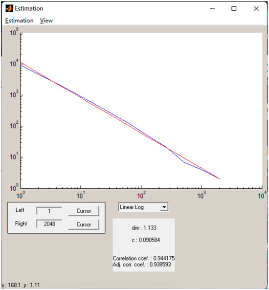 Given the substantial statistical computations involved, this paper utilizes “Fractalyse 2.4.1” to perform the calculations [27,28] (2011, 2024). Through these calculations, the dimension value of the skyline of the waterfront building complex in Fushan Bay, Qingdao, is determined to be 1.133, with a fitting correlation coefficient of 0.944 (Figure 5).