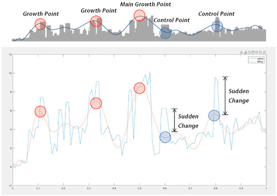 The peaks of the fitted curve represent the growth points of the skyline, with the highest peak referred to as the main growth point. When the skyline contour has prominent valleys in the fitted curve with a large difference in value, it is called a “sudden change”, and the location of this “sudden change” is referred to as the growth control point.