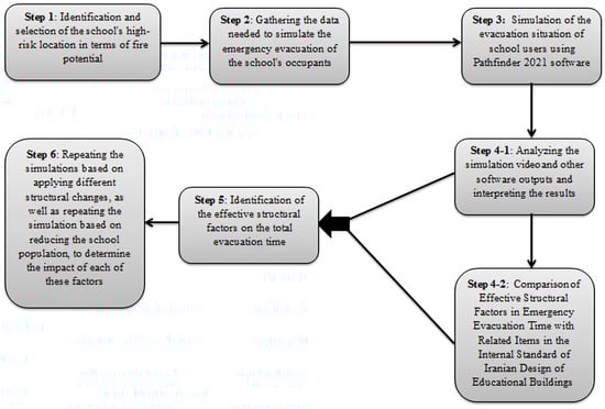 The first step involved reviewing previous studies that assessed student behavior and emergency exit situations in elementary schools during fires.