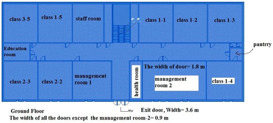 In this simulation, a fire accident was modeled in the pantry located at the eastern end of the ground floor of the school building, which has an area of 6.5 m2 and a single exit with a door width of 90 cm. The fire was assumed to have broken out at 8:30 a.m., when all students and staff were present in the school. At the time, two workers were occupying the pantry. The total number of people on the ground floor was 262.