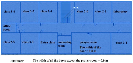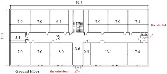 In this study, scenario 1 was chosen to simulate the exit of students from the school building. The conditions of the evacuation scenario are summarized in Table 3, while the layout of the floors and the location of the initial fire are illustrated in Figure 5 and Figure 6.