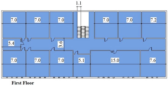 The ground floor features one staircase, while the first floor has two staircases. Through field observations and direct measurements, the dimensions of various spaces—including classrooms, management offices, the health room, counseling room, education room, staff room, laboratory, pantry, and prayer room—were recorded in the appropriate worksheets (see Table 1).