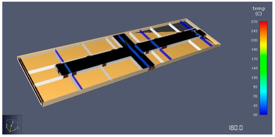 The simulation results indicated that reducing the number of students to 353 occupants decreased the total evacuation time by 128 s, allowing for complete evacuation in just 257.5 s. As shown in Figure 22, the rate of evacuation speed increased dramatically during the first 150 s, with many occupants reaching the entrance and exit doors within the first minute (see Figure 23). By the 150 s mark, only 77 occupants remained in the school (Figure 22), while 276 had successfully evacuated (Figure 24). However, after this point, increased population density in the staircases on the first and ground floors created heavy traffic, which slowed down the evacuation speed. The remaining 77 occupants managed to exit the school within an additional 107 s (Figure 24). Additionally, the Required Safe Evacuation Time (RSET) in this scenario reached 505 s, which, although reduced by approximately 200 s compared to the first mode, still exceeded the ASET.