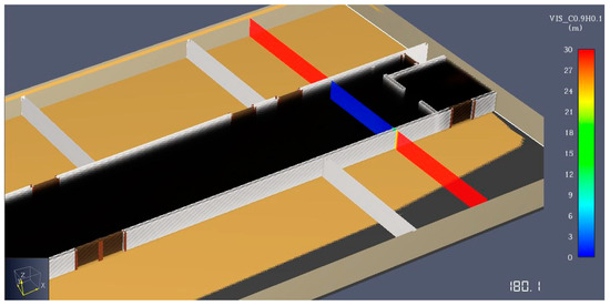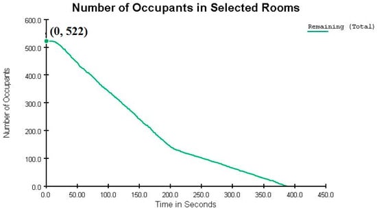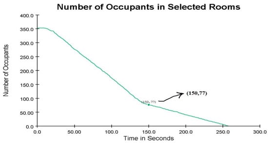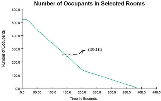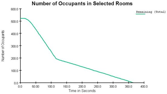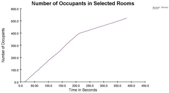 The width of the exit corridors was increased by one meter in this case. The total emergency evacuation time remained unchanged (see Figure 20). With this modification, 281 occupants were evacuated within the first 150 s, leaving 241 occupants still inside.