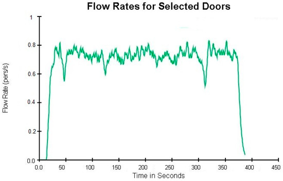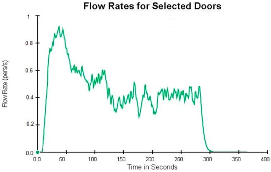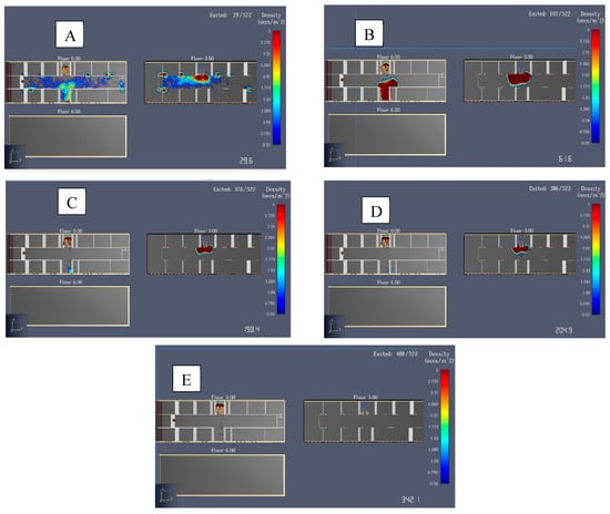 The evaluation of the current situation revealed that the evacuation time for occupants exceeded 6 min (386 s) (see Figure 12). To identify the underlying causes of this extended evacuation time, various structural characteristics were simulated, including the following: