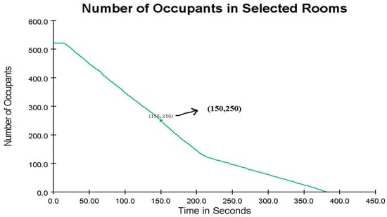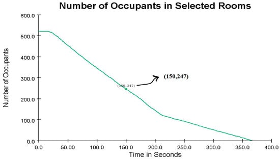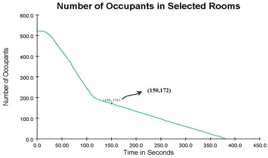 Increasing the area of the classrooms resulted in a reduction in evacuation time by 17.5 s. This expansion of the school’s space, along with a decrease in classroom population density, accelerated the emergency evacuation process (see Figure 21). With this adjustment, 275 occupants were evacuated within the first 150 s, leaving 247 occupants still inside.