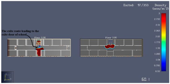 Considering the speed of vertical movement on the stairs, factors such as density and flow rate in the escape exits can psychologically impact children’s performance during emergency evacuations [34]. Therefore, in our study, we simulated an increase in the width of the exit corridors on both the ground floor and the first floor as a potentially effective geometric modification.
