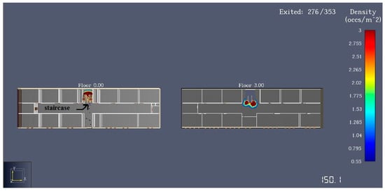 The number of people evacuated and the density of evacuation of floors 150.1 s from the start of emergency evacuation.