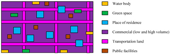 In Figure 2, commercial facilities mainly account for 0.9955, with a low plot ratio accounting for 0.2808 and a high plot ratio accounting for 0.7150. The GDP coefficient for transportation land is 0.0045, while the GDP coefficients for other land use are all set to 0. The above GDP coefficient emphasizes the need to comprehensively consider the balance between ecological, economic, and social factors in the process of urban scheming [15]. Developing a reasonable spatial layout strategy can not only effectively promote the maximization of regional GDP, but also facilitate the attainment of enduring development objectives. The specific coefficient between carbon emissions per unit area and GDP is selected to enhance the interpretability and applicability of the model, so as to provide clear and direct guidance for urban scheming and environmental protection policies. This approach enables research to focus on more concrete and practice-oriented development strategies between land use and carbon emissions, and endogenous factors drive the modeling concept of urban sustainable development. The goal of maximizing the compactness of land use can improve the efficiency of land use and reduce the social and environmental costs caused by urban expansion. The function expression is shown in Formula (3) [16].