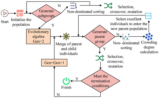The urban spatial layout model constructed in the above research involves multiple conflicting objectives, such as land use efficiency, environmental impact, and economic benefits. To select the optimal-balance value among the above objectives, the NSGA-II algorithm can be used. NSGA-II is an algorithm used to handle multi-objective optimization issues, which can simultaneously handle these objectives and find the Pareto optimal solution set, enabling decision-makers to strike a balance between different objectives [18]. This method maintains population diversity by using fitness, non-dominated sorting and crowding distance. This means that in the optimization process, it not only focuses on the fitness of individuals, but also encourages the exploration of different solutions, thereby increasing the possibility of finding diverse solutions. This is particularly important for spatial utilization decisions in urban design. However, in some cases, NSGA-II may not effectively converge to the Pareto front, especially when dealing with complex problems. This may lead to an unstable quality of the solution and affect the accuracy of the decision. Therefore, to address the above limitations, the study considers combining the approximate ideal solution ranking method with NSGA-II. The study first analyzes the process steps of the NSGA-II algorithm, as represented in Figure 3.