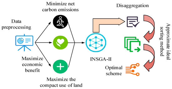 In the process of achieving sustainable development, the balance between economic growth and environmental protection is an important concept for current development. However, urban scheming is often limited to optimizing a single objective, neglecting the efficient utilization of land resources and the diversity of social needs [1,2]. In addition, traditional urban spatial scheming methods often prioritize one objective over others when dealing with multi-objective optimization, which can easily lead to resource waste and deviation from sustainable development [3,4]. Especially under the dual pressure of addressing climate change and improving residents’ quality of life, it is particularly urgent to find a spatial layout optimization method that can balance economic, environmental, and social interests. The research motivation stems from the construction of a systematic urban spatial layout model to explore the multi-objective optimization balance between net zero carbon, regional GDP maximization, and compact use of land functions. The main purpose of the research is to construct an urban spatial layout optimization model based on the concept of net zero carbon, in order to maximize the reduction of net carbon emissions, the improvement of regional GDP, and the optimization of land use compactness. The research aims to find a new urban scheming approach through multi-objective optimization methods to promote the coordinated development of cities while striking a balance between sustainable growth and ecological preservation. To achieve this goal, a spatial optimization method combining the approximate ideal solution ranking method and NSGA-II is studied. This paper innovatively introduces the approximate ideal solution sorting method into NSGA-II to overcome the limitations of traditional algorithms in multi-objective optimization. This combination helps to improve the distribution uniformity of the population in the solution space. Grounded on this, the algorithm can better capture the characteristics of the Pareto frontier and then improve the scientific and effective decisions. For the first time in the field of urban renewal, a multi-objective optimization framework with “net zero carbon” as the core is proposed. It fully considers the comprehensive effects of carbon emissions, regional GDP and land use compactness, filling the gap in existing research.
