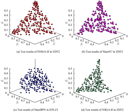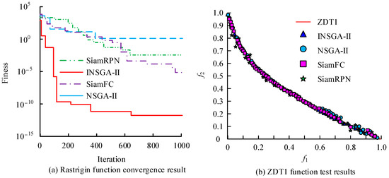 To test the performance of the proposed algorithm, three testing functions were used to validate it. The testing functions included the Rastrigin function, ZDT1 function, and ZDT2 function, among which the Rastrigin function is a commonly used single-objective optimization testing function, commonly used to test the performance of global optimization algorithms. The ZDT1 function is a bi-objective problem aimed at evaluating the effectiveness of optimization algorithms in balancing constraints and complex objectives, with the optimal solution located at the boundary between the first and second objective functions, forming a curved Pareto front. The ZDT2 function is a three-objective function that is suitable for evaluating the performance of algorithms in complex, multidimensional optimization problems. The Pareto front presents a complex shape, and due to the introduction of complex objective relationships, decision-makers need to weigh their choices among multiple objectives. At the same time, a comparative analysis was conducted using traditional NSGA-II, Siamese Region Proposal Network (SiamRPN), and Siamese Fully Convolutional Network (SiamFC) algorithms [19,20,21]. The solution results of the model in the Rastrigin function and the ZDT1 function are shown in Figure 5.