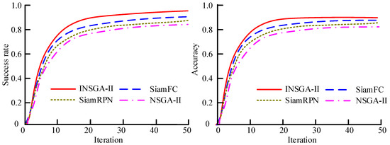 In Figure 6, the study used the HyperVolume (HV) index to evaluate the solution values of the model. Figure 6a shows the solution set distribution of the INSGA-II algorithm, with an average HV value of 5.42 × 10−1, which is about 18.6% higher than the traditional NSGA-II algorithm. Compared to the SiamRPN algorithm and the SiamFC algorithm, it is 9.6% and 9.0% higher, respectively. The results indicate that the proposed method can find solutions closer to the Pareto front and better balance various objectives in the optimization process. To further validate the solving ability of the model, the study conducted validation using the TrackingNet dataset. TrackingNet is a dataset used to assist in solving multi-objective problems, with the main evaluation metrics including success rate and accuracy. The performance results of the proposed model in the TrackingNet dataset are shown in Figure 7.
