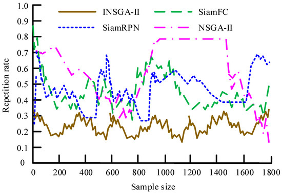 Figure 7a shows the success rate of the algorithm on the TrackingNet dataset. The results show that the success rate of the INSGA-II algorithm is 0.937, which is 0.041, 0.062, and 0.118 higher than that of SiamRPN, SiamFC, and NSGA-II, respectively. Figure 7b shows the solution accuracy of the algorithm on the TrackingNet dataset. The results show that the solution accuracy of INSGA-II reaches 0.904; the accuracy of SiamRPN is 0.871, the accuracy of SiamFC is 0.858, and the accuracy of NSGA-II is 0.813. The results of solving the repetition rate on the TrackingNet dataset are shown in Figure 8.