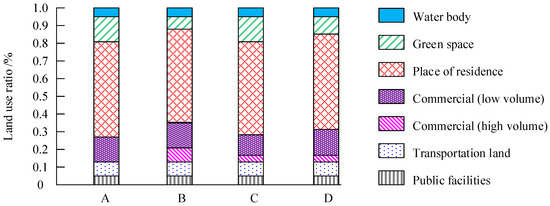 The results in Figure 10 show that Scheme D has the highest proportion of low plot ratios for commercial and public facility land, at 20.62%. This indicates that the scheme fully considers the needs of urban residents, provided a good environment for commercial activities, and enhances the community’s service capacity, thereby improving the quality of life of residents. The urban green space ratio of Scheme A is 0.2312, which is higher than that of other schemes. The proportion of urban green spaces in Schemes B, C, and D is relatively low, at 0.1501, 0.1904, and 0.1477, respectively. Although Scheme D has a slightly lower proportion of urban green space compared to Scheme A, the overall resource allocation is more reasonable and can effectively support the city’s multi-functionality and sustainable development. By balancing carbon emissions, economic development, and land use, Scheme D demonstrates its potential and effectiveness in sustainable urban development, providing a reliable strategic basis for future urban layout optimization.