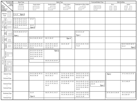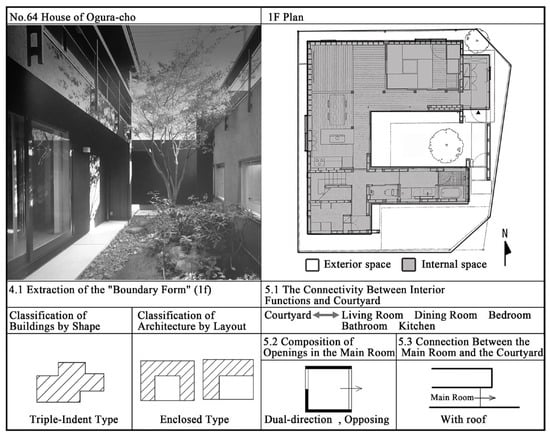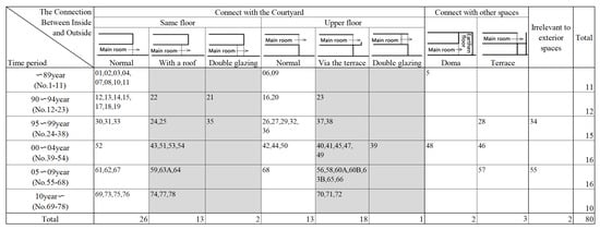 - Matsumoto, M.; Hattori, M.; Taniguchi, M. The Characteristic Analysis and Spatial Typology of Urban Court-Houses: A Study on Spatial Composition of Japanese Contemporary Houses. J. Archit. Inst. Jpn. Plan. 2001, 547, 135–142. [Google Scholar]