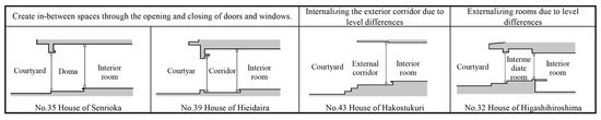 - Kawakita, T. The Arrangement of the Exterior Space and the Interior Space in the Houses Published in 1990 Designed by Japanese Architects. J. Archit. Inst. Jpn. Plan. 1997, 497, 103–110. [Google Scholar]