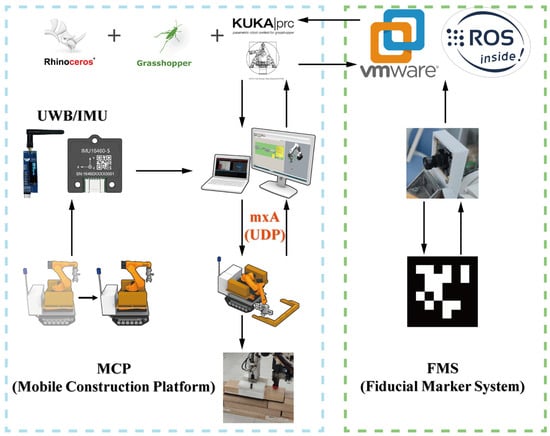 System hardware and software architecture. Software: Rhinoceros 8.18 (with Grasshopper and KUKA|prc), VMware Workstation 16.2.4, and ROS running on 64-bit Ubuntu; Hardware: Mobile Construction Platform (MCP) equipped with UWB/IMU sensors and a vision-based localization module using a Fiducial Marker System (FMS).