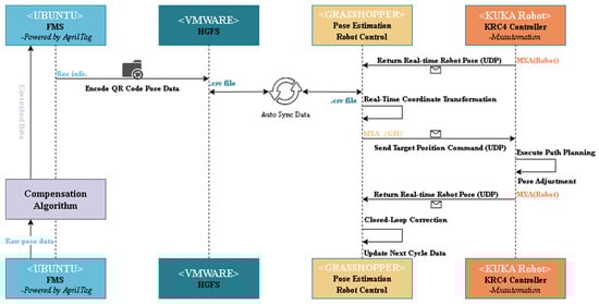 The real-time communication and feedback control of the system primarily rely on VMware’s host–guest file system (HGFS) technology and KUKA’s mxAutomation robotic arm system extension (see Figure 3). The real-time pose information of the QR code tags is recorded in a shared folder on the virtual machine. Through VMware’s HGFS, these data are automatically synchronized to the host computer, where Python3 scripts in the Grasshopper environment read and parse the information. Subsequently, Grasshopper performs a coordinate transformation on the camera coordinates based on the current pose of the robotic arm—periodically provided by the KUKA controller’s mxAutomation interface via joint angles or end-effector pose—to map the detection results to real-world positions within the robotic arm’s base coordinate system.