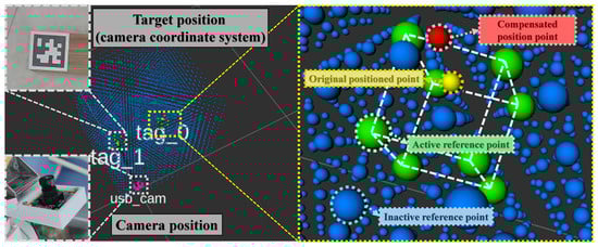 During operation, a real-time compensation algorithm further refines the accuracy of the fiducial marker (FMS) subsystem. First, a set of “reference points” is acquired offline: the KUKA KR6 manipulator, whose repeatability is ±0.03 mm, carries the camera module to sample a QR code target at many known poses throughout the camera’s three-dimensional field of view. The resulting dense dataset forms an error lattice that captures systematic biases, such as lens distortion and residual calibration offsets.