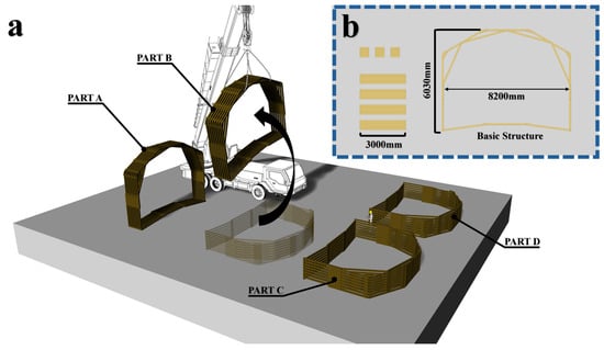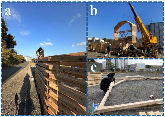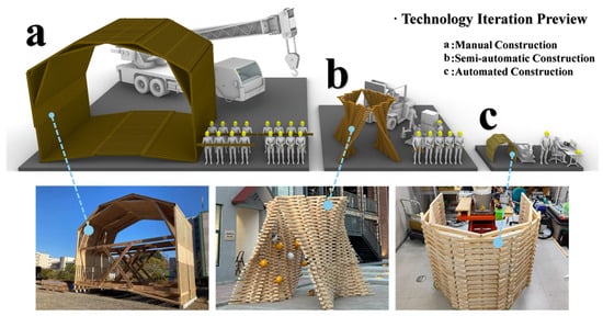 Practical semi-automated construction experiments reveal that although automation offers substantial advantages for handling complex architectural forms, issues such as safety, human resource coordination and assembly precision remain. For instance, human–robot collaboration demands high team coordination and operator expertise; prolonged operations may increase safety risks; and excessive segmentation of components can lead to cumulative errors during final assembly. Under the improved experimental process and platform, researchers achieved continuous assembly of a 1:6 scale model through four successive lifts along the z-axis, reducing personnel requirements to just two (a robotic arm operator and a timber supply operator) and significantly enhancing efficiency and smoothness (see Figure 12).