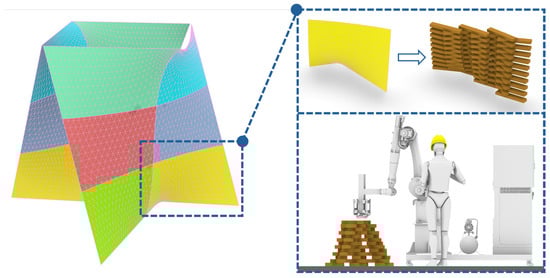 Due to the requirement to complete the assembly through multiple movements, it was necessary to pre-split the target component into sections. The splitting logic was to minimize the number of platform movements while ensuring that the assembly of each section was not compromised, thereby enhancing overall efficiency. As a result, the model was divided into four parts, requiring three platform movements for assembly, with a 5 mm gap between each timber brick to accommodate the errors caused by vibrations of the robotic arm and the mobile platform.