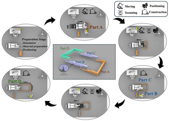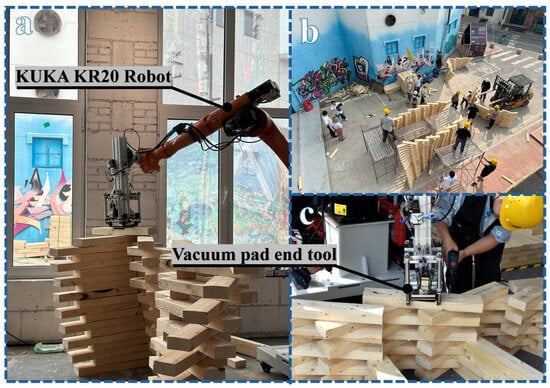 However, on-site assembly of timber structures is still predominantly manual, with limited integration of digital technologies into field operations, thereby restricting further improvements in construction efficiency []. To overcome the spatial and flexibility constraints of traditional stationary CNC equipment, robotic technologies have increasingly gained prominence in timber construction. Robots can directly utilize digital design data to perform precise, rapid and flexible construction operations, thus effectively promoting the automated assembly of non-standard timber components []. In particular, advancements in robotics have led to growing applications of mobile robotic systems on construction sites, aiming to enhance productivity, improve construction safety and extend operational space and component scale [,,,,,,,,,,,].