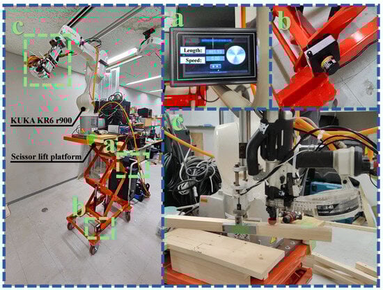 With the exception of timber supply, the entire construction process was carried out by a KR6 robotic arm and its associated automated equipment, successfully building a 1:6 scale experimental model of the building from the case in Section 4.1 within its working radius. For the purpose of fully automated construction, as shown in Figure 10, the design of the experimental platform incorporated a scissor lift platform along with an integrated pneumatic gripper–nailing end effector. The lift platform significantly extended the KR6 robotic arm’s workspace in the z-axis. To obtain real-time height variation data, a linear encoder position sensor was installed on the platform, synchronizing the lift data with the PC in real time, thereby allowing for appropriate adjustments to the construction program. The integrated end effector enables fully automated timber positioning, placement and connection.