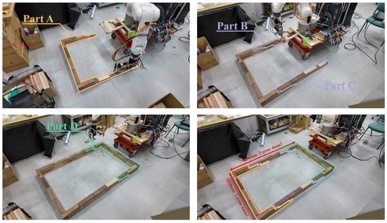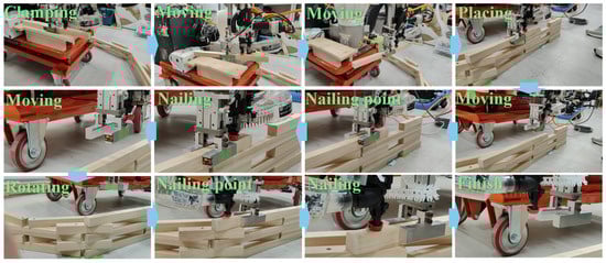 During the experiment, as shown in Figure 19, the system effectively assisted the experimental platform in completing the predetermined assembly task. A total of 80 timber bricks were assembled in 1 h and 46 min, including two instances of repositioning and re-localization. The overall process demonstrated smooth operation and precision that met the design expectations. The assembled experimental model measured 1556 mm in length and 1058 mm in width; compared to the pre-set dimensions (1560 mm and 1060 mm), the cumulative dimensional errors were 4 mm and 2 mm, respectively, which are well within the anticipated range. In summary, the authors successfully reproduced the workflow described in Section 5.1 using the experimental platform, achieving fully automated mobile timber assembly in a laboratory environment and further advancing the process iteration.