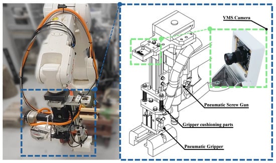 To minimize interference and mechanical damage from vibrations during simulated timber construction, the camera module is mounted on the exterior of the robot arm’s end effector, positioned away from the gripper and nailing zones. Additionally, the system is outfitted with a custom multi-function end effector that integrates both gripping and nailing functions, a HIKOKI EC1445H3 mini air compressor, a notebook computer for operation and monitoring and a UWB/IMU fusion-based positioning system, all of which further enhance overall system stability and positioning accuracy.