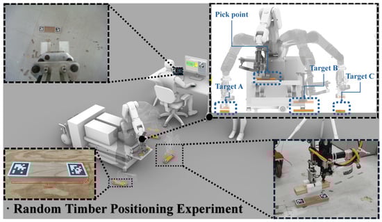 Based on the deconstruction of traditional timber construction processes and previous technological iterations, this chapter primarily validates the precision and robustness of the core visual positioning system within the workflow proposed in Section 3.4. Finally, using a small-scale experimental platform, the entire process is comprehensively validated in an indoor environment. By employing timber bricks measuring 245 mm × 60 mm × 30 mm for simulated timber assembly tests, both random timber block positioning experiments and simplified small-scale timber construction tests were conducted, further verifying the reliability of the automated on-site construction solution based on the visual positioning system in actual timber construction. As shown in Figure 13, based on the previous experimental platform, the authors integrated the VMS camera into the end effector. This lightweight platform simulates a realistic timber construction scenario in an indoor laboratory environment, providing a reliable and controllable testbed for evaluating system performance, robustness and accuracy.
