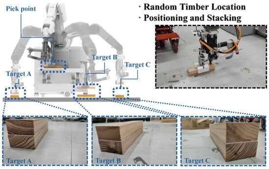 Building on the previous experiments, this study further designed a simplified, small-scale mobile timber assembly experiment in an indoor setting based on the experimental platform. The objective was to demonstrate the feasibility of the proposed method and workflow for full-scale on-site timber construction scenarios described in Section 5.1.