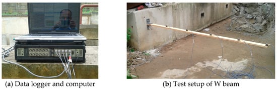 In this study, experiments were carried out using the OMA method (AVT). For the measurements, the beams were first prepared to provide the desired boundary conditions. The beams were fixed to the concrete block by screwing. Five single-axis accelerometers were used in the experimental measurements. Accelerometers were placed on the test samples at equal intervals and in a way to measure the reactions in the vertical direction. The test setup is given in Figure 7. The data logger device and the recording computer were given in Figure 7a. The other photographs in Figure 7 were photographs of different beams taken from different angles to understand the experimental setup. In the measurements, the frequency range was selected as 0–800 Hz, and 10-min measurements were taken. Vibrations were produced by randomly hitting the concrete block to which the beams were attached with a plastic-tipped sledgehammer. Thus, it was aimed to provide a homogeneous vibration (from every point) in the cantilever beams. During the measurements, the signals from the accelerometers were simultaneously subjected to Fourier transformations in the PULSE [49] data acquisition interface program and recorded on the computer. The representative model and accelerometer placement created in the PULSE R 11.2 program are given in Figure 8. The figure contains a screenshot taken from the program. The figures shown with vertical arrows represent accelerometers (Figure 8).