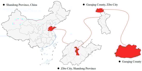 This study takes Gaoqing County, Zibo City, Shandong Province (Figure 1) as the research object and focuses on the rural public service facilities in the area. According to the relevant information, it is known that Gaoqing County has a topography typical of northern Shandong Province, with a relatively flat terrain and villages distributed relatively evenly, showing the relevant development characteristics along roads and rivers. The current distribution of villages in Gaoqing County reflects the traditional characteristics of the northern plain area, with its extensive agricultural land, scattered settlements, and relatively concentrated town and village centers, which are common in Shandong Province and the northern plain area. As the county’s topography and the distribution of towns and villages are typical of the region, the research results in this paper are of certain reference value for the study of the demand for rural public service facilities in Shandong Province and, even, in the North China Plain region.